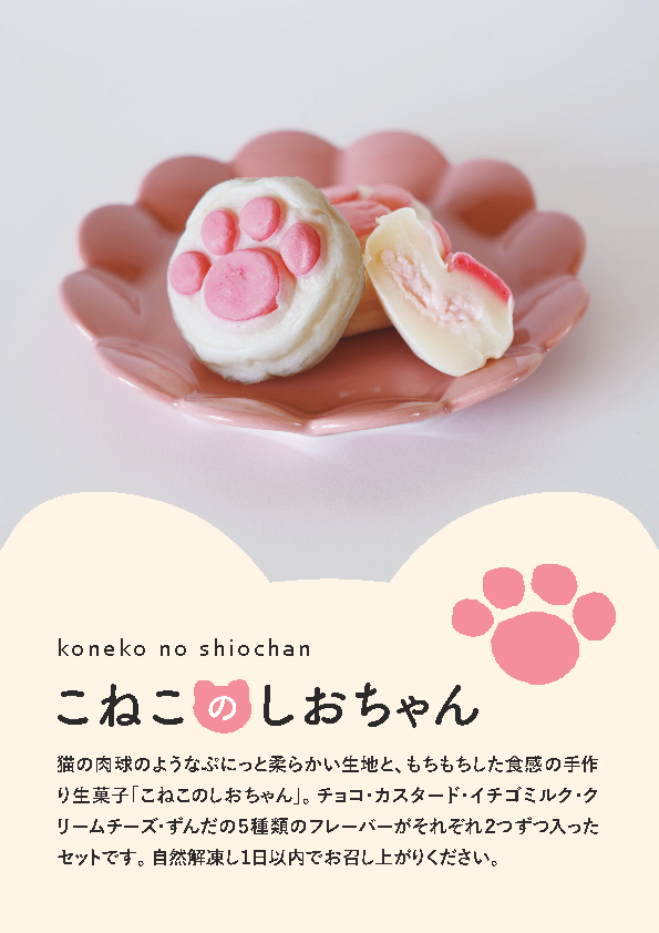 ねこ好きにはたまらない!ぷにぷに&もちもちの生菓子が新登場。まるで肉球のような見た目と弾力の生地でクリームを包みました。クリームはカスタード、イチゴミルク、チョコ、クリームチーズ、ずんだの5種。ギフトにも喜ばれます。