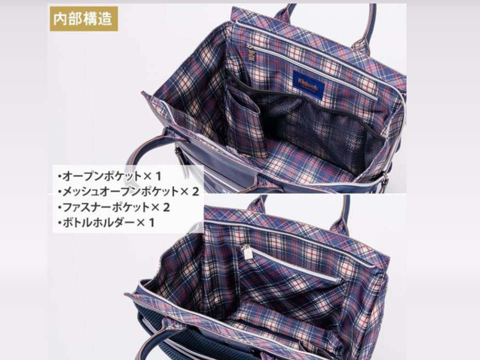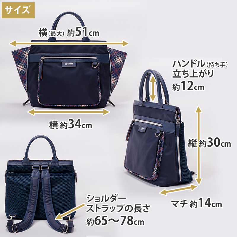 - 【2WAYトートリュック(本体)】 〈外寸〉:約 横34cm × 縦30cm × マチ14cm 〈最大幅〉:約 51cm 〈持ち手高さ〉:約 12cm 〈ショルダーストラップ長さ〉:約 65〜78cm 〈重量〉:約 780g 〈開閉〉:シングルファスナー 〈底びょう〉:あり 〈収納〉 ●内側 ・オープンポケット ×1 ・メッシュオープンポケット ×2 ・ファスナーポケット×2 ・ボトルホルダー ×1 ●外側 ・前面:ファスナーポケット ×1、Dカン ×1(内側ナスカン付きキーストラップ) ・背面:ファスナーポケット ×1 ・背面:ショルダーストラップ収納ポケット ×1(Dカン ×2) 〈素材〉 本体:ナイロン(無地) タータン部分:ポリエステル(タータンチェック) 持ち手:合成皮革 ショルダーストラップ:ポリエステル 【多機能ポーチ】 〈サイズ〉:約 横23cm × 縦14cm × マチ4cm 〈重量〉:約 180g 〈開閉〉: シングルファスナー 〈収納〉:メッシュポケット ×1/ファスナーポケット ×1/カード入れ ×8 /仕切り ×3 〈素材〉:ナイロン、ポリエステル(タータン)