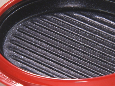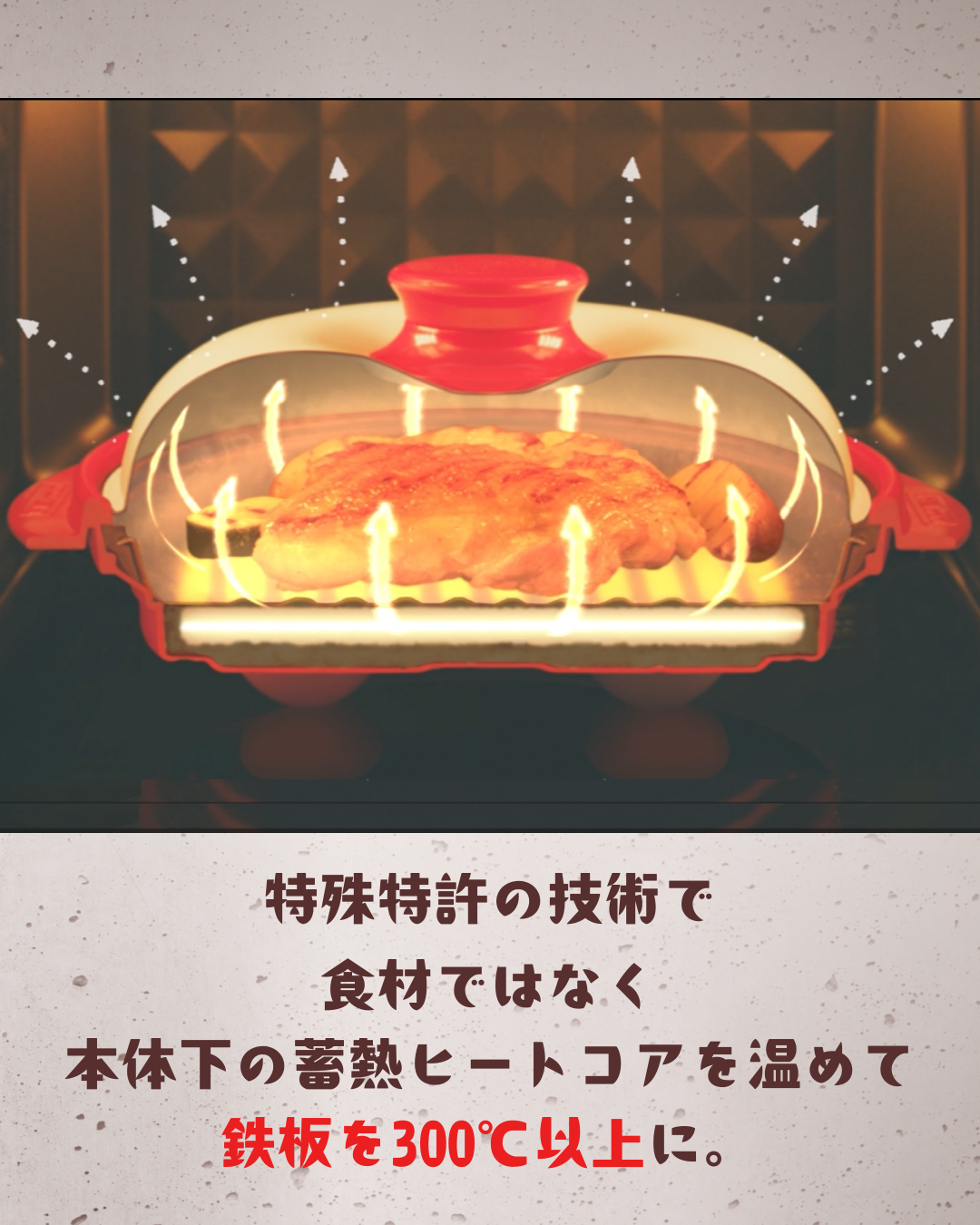 電子レンジのマイクロ波を食材ではなく本体下の蓄熱ヒートコアだけに当てる特許取得の特殊構造で、鉄板が300度以上の高温に。