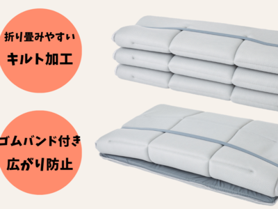 さらに折り畳みやすいキルト加工となっているため、折り畳みやすく、コンパクトに収納できます。ゴムバンドもついているので広がらず、収納に便利です。