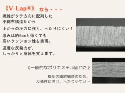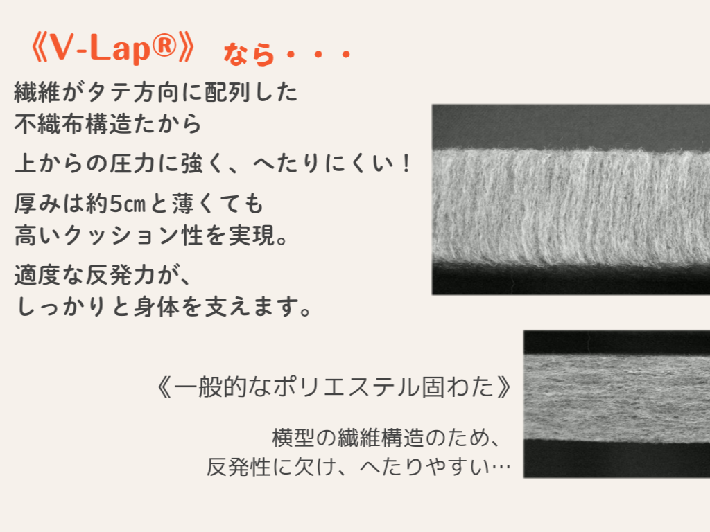 繊維がタテ方向に配列した不織布構造の「V-Lap®」は、軽量・通気性と弾力を併せ持ち、身体をしっかりと支え、快適な寝心地を実現しました。