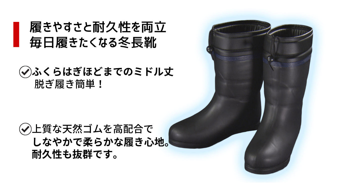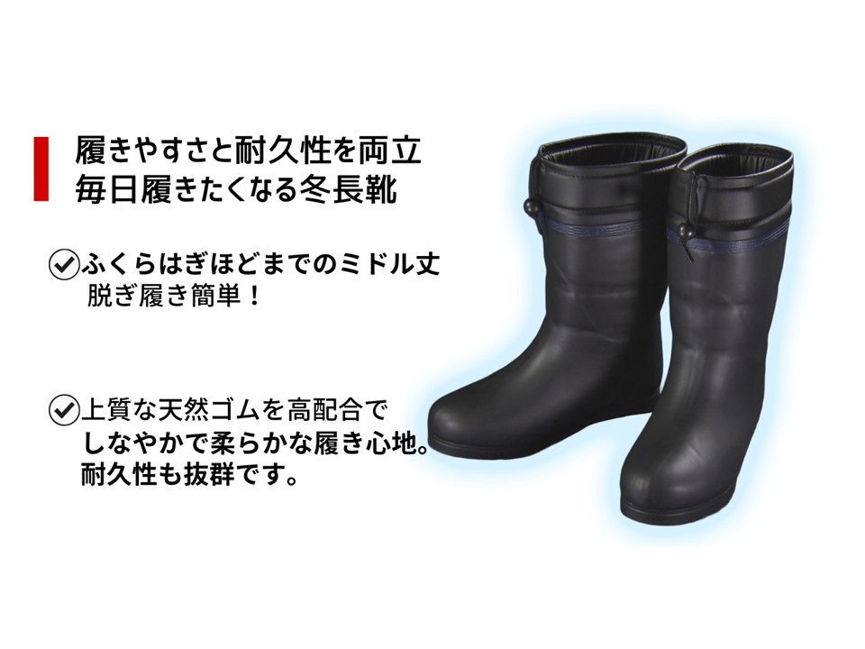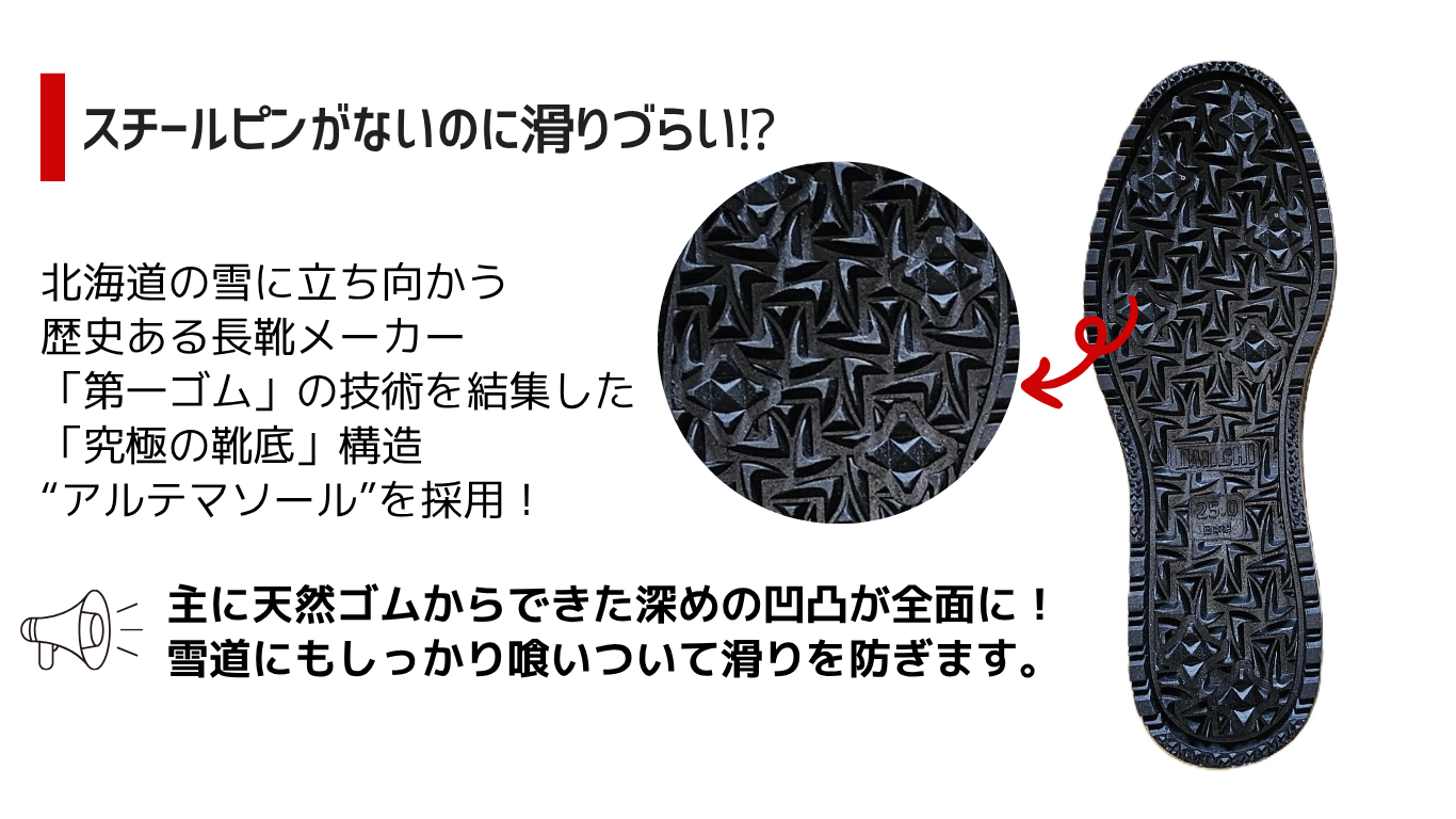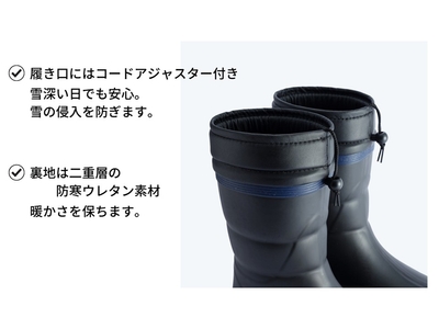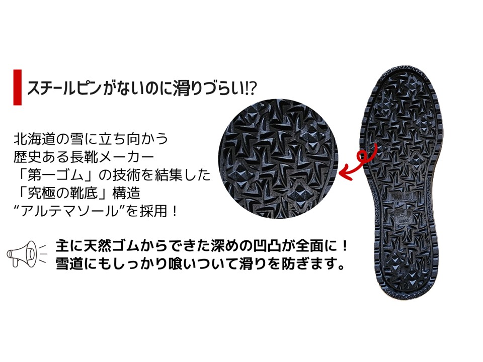 - 裏地は二重層の防寒ウレタン素材で暖かさを保ちます。/表素材:天然ゴム、合成ゴム、他/裏地:ウレタン/底材:アルテマソール(ピンスパイクなし)/中敷:なし/重さ:片足約500g