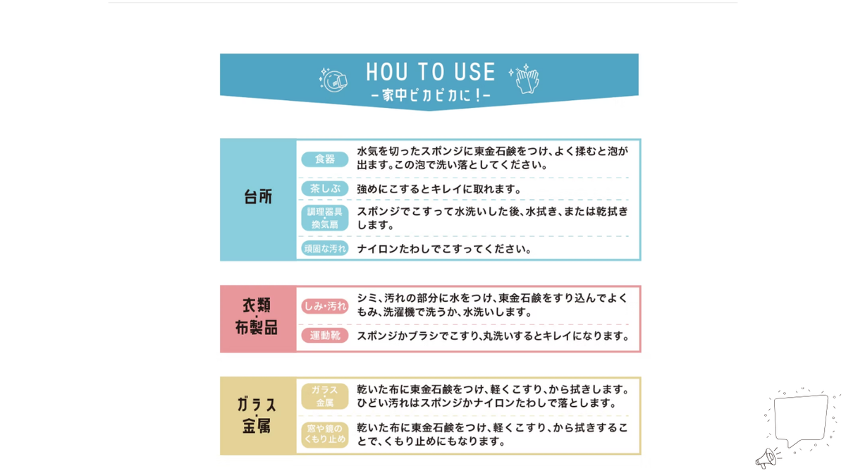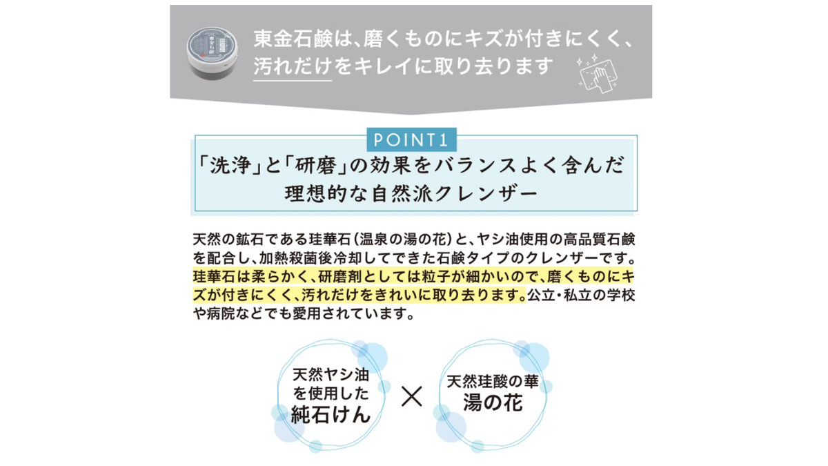 - 研磨剤(50% けい酸系鉱物)、界面活性剤(10% 純石けん分)