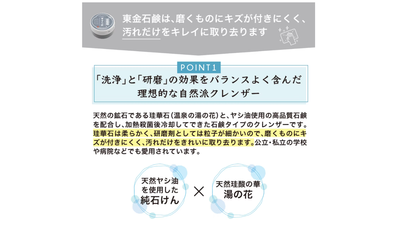 鹿児島・霧島温泉の天然鉱物「湯の花(珪華石)」とヤシ油由来の純石けん分を配合。