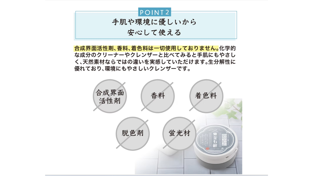 合成界面活性剤・香料・着色料は一切不使用で、環境にも手肌にもやさしい自然派クレンザーです。