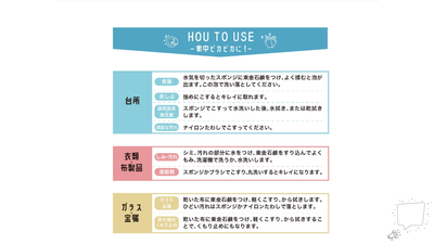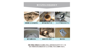 キッチン周り、浴室、トイレなど幅広い用途に対応し、これ一つで家中をきれいにできます。