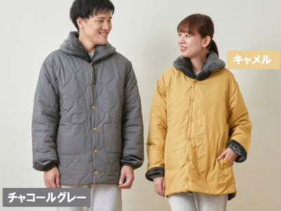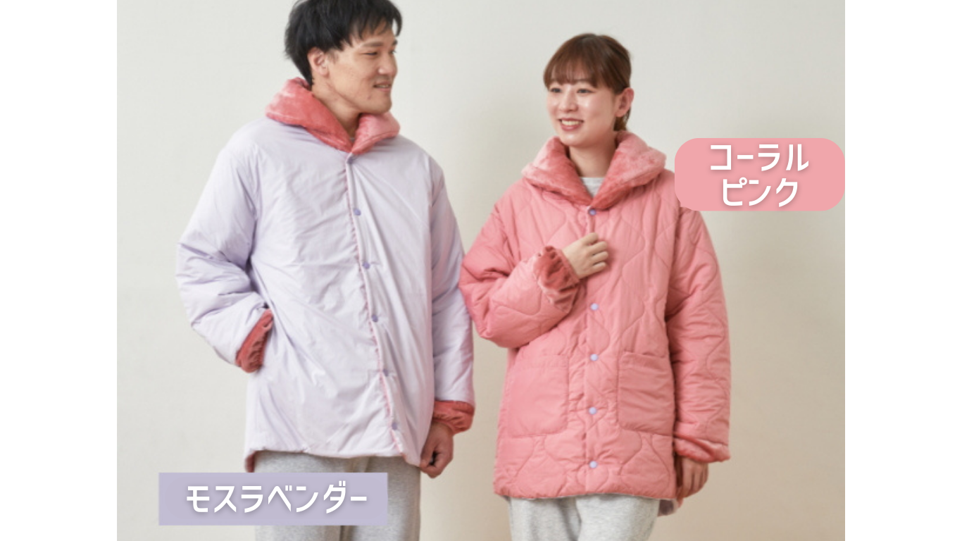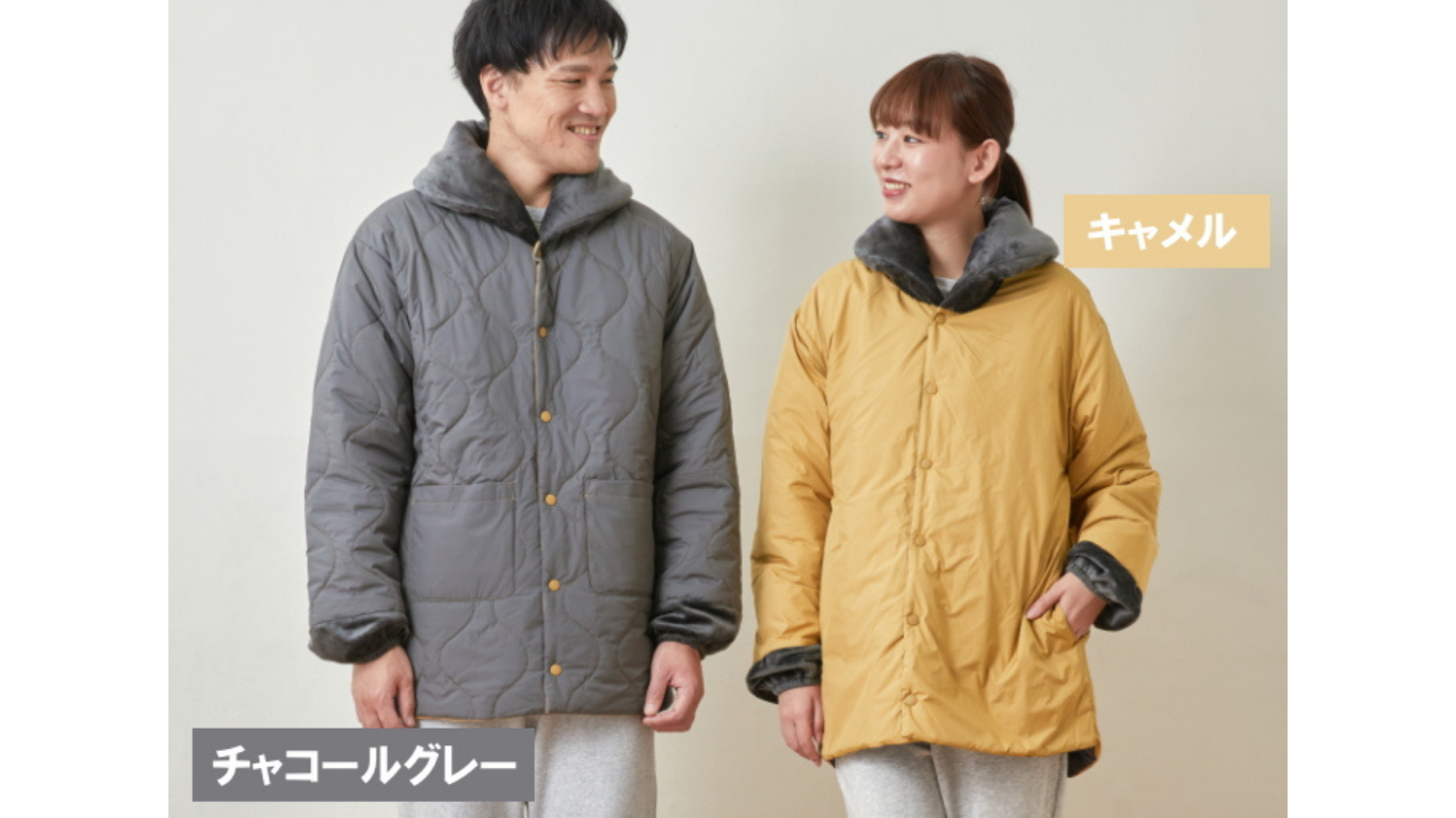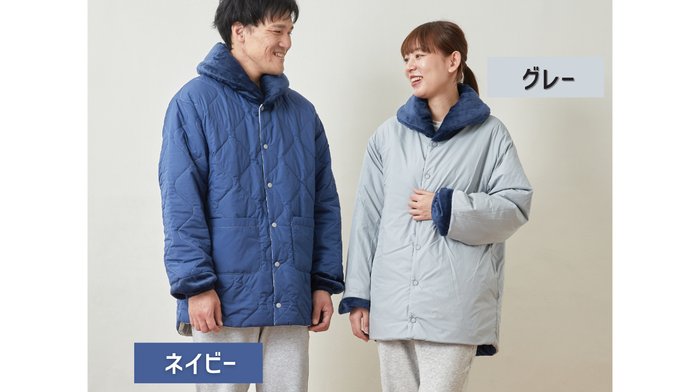 わずか約480g(S-Mサイズ)という軽さで、長時間着ても疲れにくい設計。側生地には、保温に優れたもっちりとした高密度織物を使用しています。軽さと暖かさを両立しているので、部屋着としてはもちろん、ちょっとした外出にもぴったりなリラックスウェアです。
