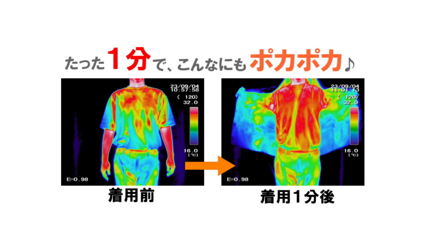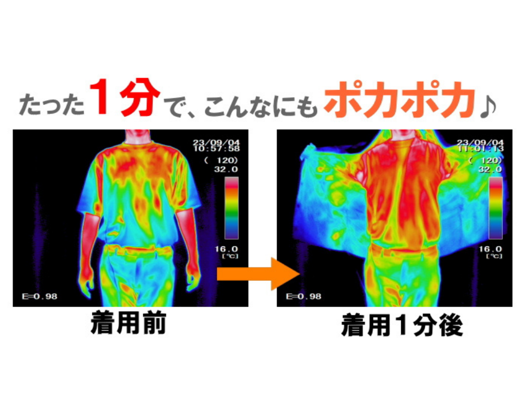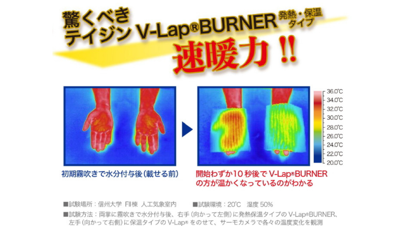 テイジン独自の高機能素材「V-Lap®BURNER」を使用、吸湿発熱繊維が体から出る水分に反応して発熱し、その熱を保温層がしっかりキープ。着用からわずか1~2分で暖かさを実感できます。寒い冬に便利です。
