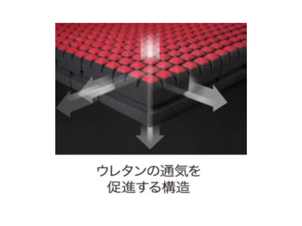 4層構造のウレタンにクロススリットを採用。タテ・ヨコにクロスするスリットが縦方向と横方向に通路を作り、汗や湿気を効率的に逃がします。