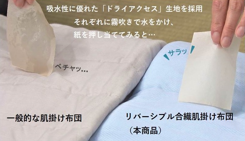 一般的な肌掛け布団と、「ドライアクセス」生地を使用した本商品に霧吹きで水をかけ、紙をあててみると…